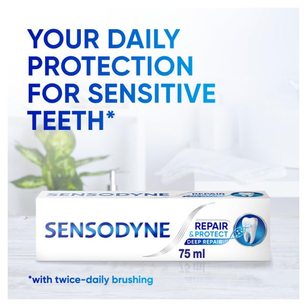 Sensodyne Repair & Protect Original Toothpaste 75ml Sensodyne Repair and Protect Deep Repair Original is a daily fluoride toothpaste. It is clinically proven to provide relief from tooth sensitivity and deliver long-lasting protection with twice daily brushing. The formula creates a robust reparative layer (which is harder than your natural dentine) over and within exposed dentine, to help relieve you of the discomfort of tooth sensitivity. Advanced science revealed how deeply Sensodyne Repair & Protect Deep Repair can repair sensitive teeth. The formula was tested at one of the largest synchrotron facilities in the world, using powerful imaging technology. For the first time, synchrotron studies have allowed scientists to look deep inside teeth to see how toothpaste formulations help to block dentine tubules over time. Tubules 1/50th the diameter of a human hair were examined to look deeper into tooth repair. Brush with Sensodyne Repair & Protect Deep Repair toothpaste for sensitive teeth twice but not more than three times, every day. Try to minimise swallowing and spit out. Make sure to close the cap after each use to protect the contents from moisture. The carton ends have been glued down. Do not use if carton ends are open. Warnings & precautions: Keep out of reach of children. Not for use by children under 12 years of age, unless on the advice of a dentist or doctor. Sensitive teeth may indicate an underlying problem which needs prompt care. If symptoms persist or worsen, see your dentist. If irritation occurs, discontinue use. Talk to your dentist or doctor as soon as possible if you experience swelling of the mouth or face.