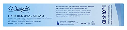 Dimples Hair Removal Cream is the gentle, easy way to remove hair and the result lasts up to twice as long as shaving. It works by dissolving hair below the skin’s surface, leaving you with gorgeous, stubble-free skin. It is enriched with antioxidant Vitamin E and