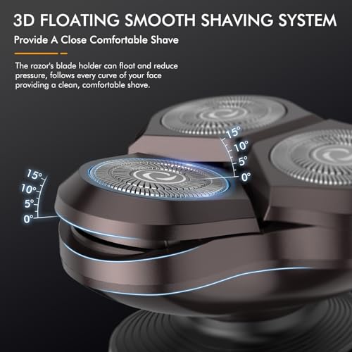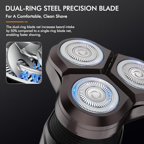 【Double-track Cutter and 3D-Floating Head】Equipped with a Dual-ring Steel Precision Blade, Electric Razor for Men increases beard intake by 50% compared to a single-ring blade. The 3D Floating Smooth Shaving System of mens electric shavers ensures a close and comfortable shave that effortlessly follows the curves of your face. The floating blade holder of Shavers for Men reduces pressure, providing a smooth and irritation-free shaving experience.