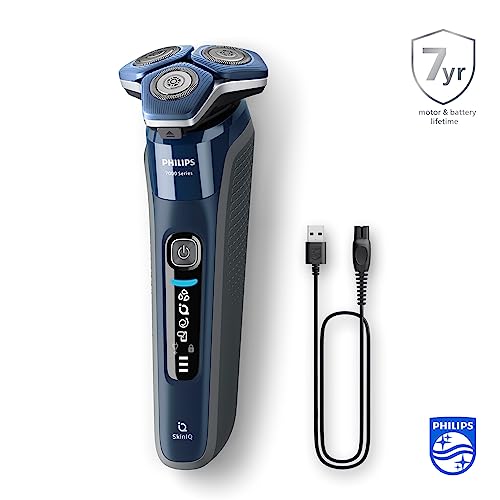 From world’s #1 Electric shaver brand****: The Philips Series 7000 glides smoothly over your skin while cutting each hair close – even on 3-day beards. A protective coating lies between the shaver heads and your skin. With up to 90.000 cutting actions per minute, the SteelPrecision blades shave close, cutting more hair per stroke*. The 45 high-performance blades are self-sharpening and made in Europe. Motion-sensing technology tracks how you shave and guides you to a more efficient technique***. Perfect your shave by pairing your shaver with the Philips GroomTribe app. Track the progress of your skin, personalize your shave and master your technique. The intelligent facial-hair sensor reads hair density 250 times per second. The technology dynamically auto-adapts cutting power for an effortless and gentle shave. Fully flexible heads turn 360° to follow your facial contours. The new shape of the shaving heads is engineered for precision. The surface is enhanced with hair-guiding channels, designed to move hair into an effective cutting position. At the touch of a button, flip open the shaver head and rinse with water. With Wet & Dry, you can go for a comfortable dry shave or a refreshing wet shave. You can shave with gel or foam even under the shower. Complete your look using the shaver’s pop-up precision trimmer. Integrated into the shaver’s body, it’s the ideal way to maintain a moustache and trim sideburns. Our shavers motor and battery are engineered for durability, having long-lasting power for a powerful shave. USB adaptor not included. *Tested versus Philips Series 3000 **compared to non-coated material ***Based on Philips Series S7000 and GroomTribe app users in 2019 ****Euromonitor International Limiter, retail sales value, per body shavers category definition, 2022 data, research conducted in December 2022