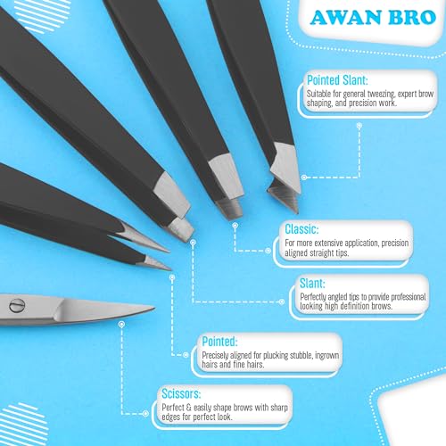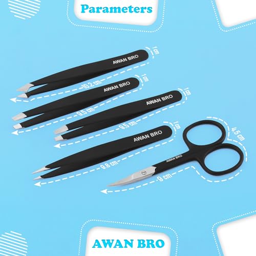 STAINLESS STEEL DURABILITY: Each AWAN BRO tweezers in this set is meticulously engineered from durable, rustproof stainless steel; these tweezers are not only rustproof but also built to last. No more worrying about wear and tear; you can count on their longevity and impeccable performance to maintain your grooming routine for years to come.