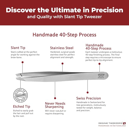 Handmade Stainless Steel Quality: Made from rust-proof, surgical-grade stainless steel, Regine Switzerland tweezers are engineered to last a lifetime. Each pair goes through a rigorous 40-step finishing process, followed by a final inspection under a microscope, ensuring perfectly aligned tips for flawless performance. The etched tip design ensures ultimate precision and durability.